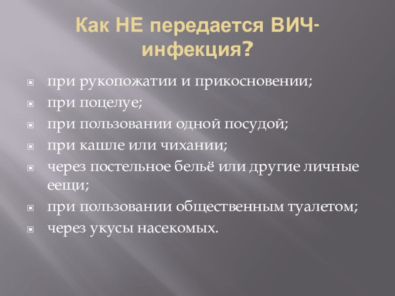 Слайд 12Как НЕ передается ВИЧ-инфекция?