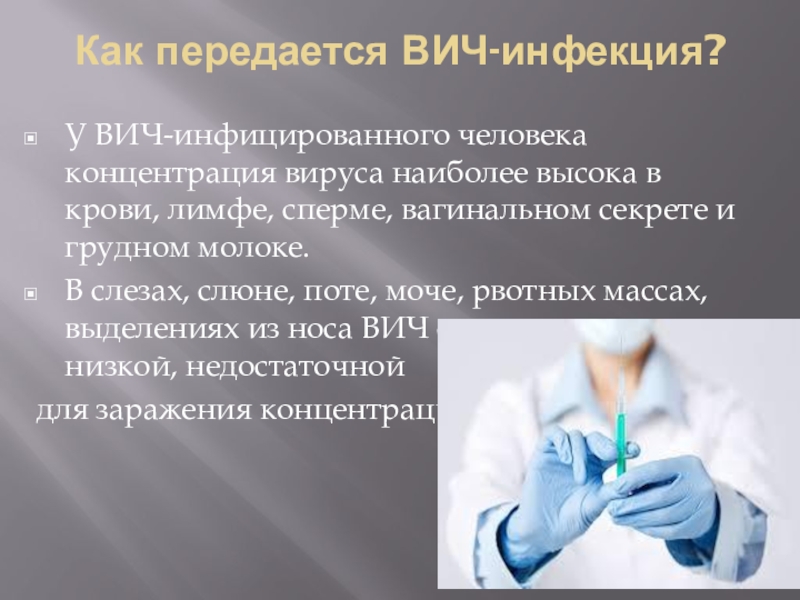 В слезах, слюне, поте, моче, рвотных массах, выделениях из носа ВИЧ содержится в очень низкой, недостаточной