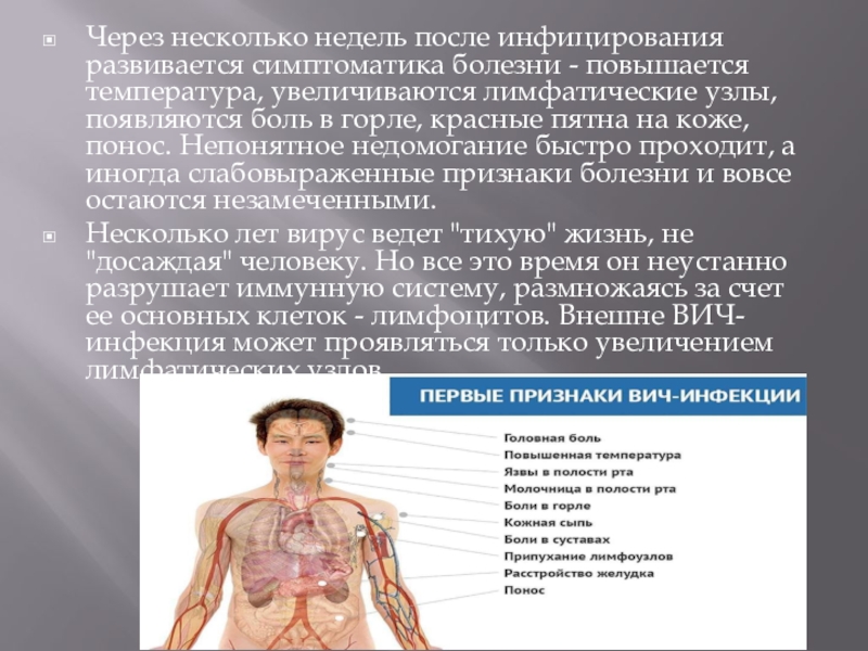 Слайд 3Через несколько недель после инфицирования развивается симптоматика болезни - повышается температура,