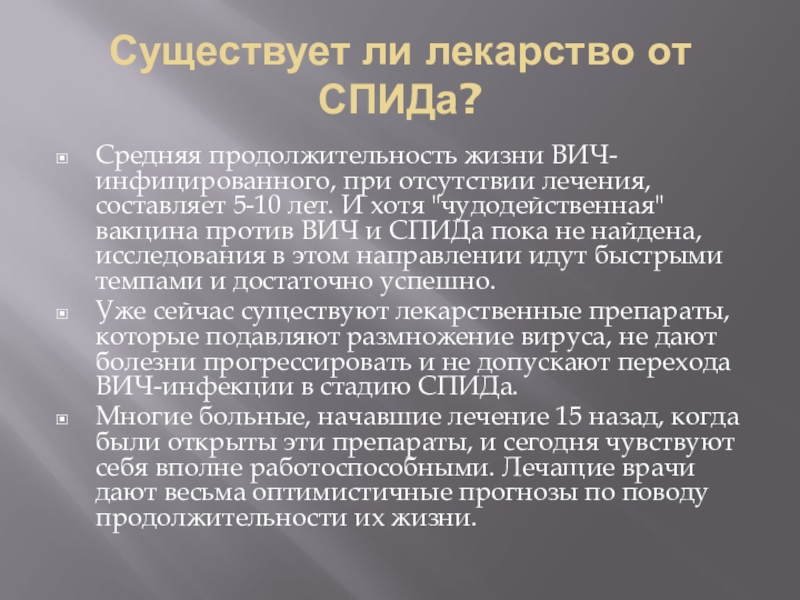 составляет 5-10 лет. И хотя "чудодейственная" вакцина против ВИЧ и СПИДа пока не найдена, исследования в этом направлении идут быстрыми темпами и достаточно успешно.