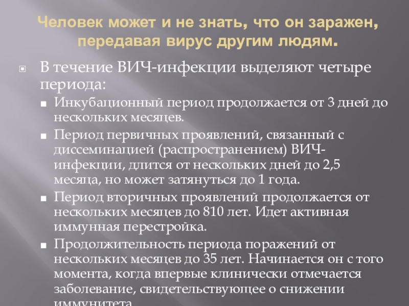 Слайд 4Человек может и не знать, что он заражен, передавая вирус другим
