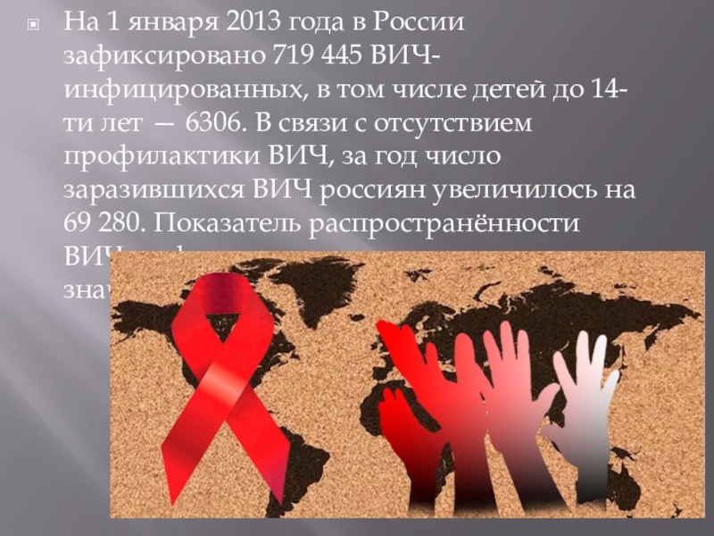 Слайд 16На 1 января 2013 года в России зафиксировано 719 445 ВИЧ-инфицированных,