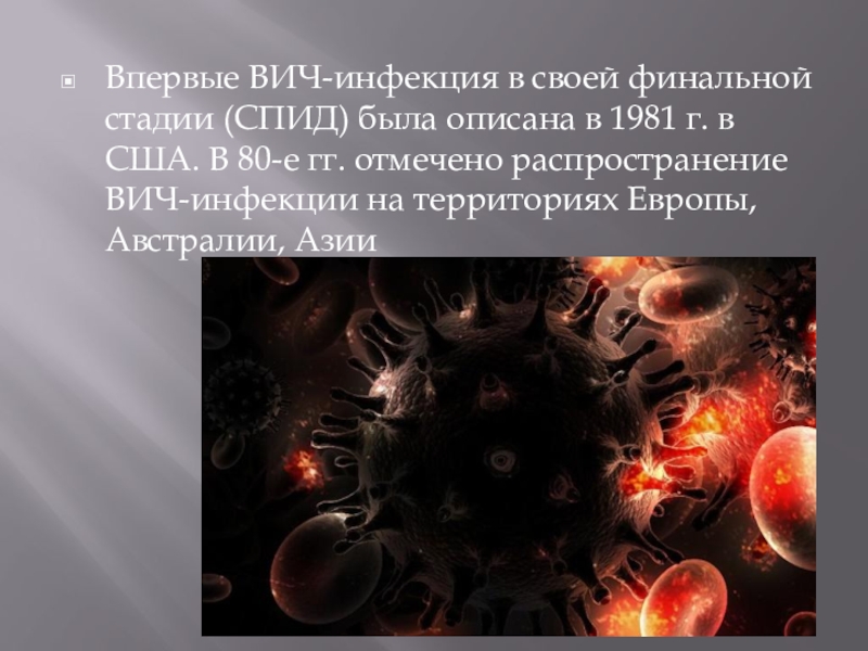 г. в США. В 80-е гг. отмечено распространение ВИЧ-инфекции на территориях Европы, Австралии, Азии
