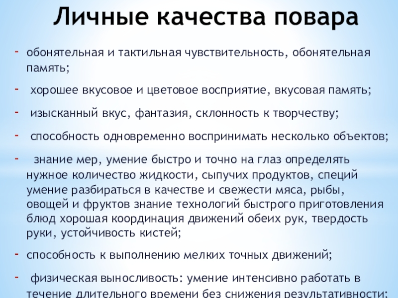 знание мер, умение быстро и точно на глаз определять нужное количество жидкости, сыпучих продуктов, специй умение разбираться в качестве и свежести мяса, рыбы, овощей и фруктов знание технологий быстрого приготовления блюд хорошая координация движений обеих рук, твердость руки, устойчивость кистей;