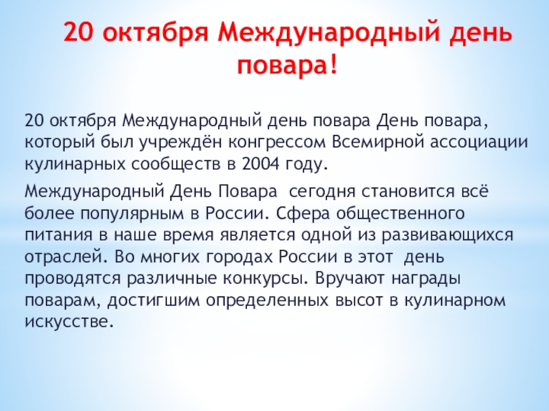 Международный День Повара сегодня становится всё более популярным в России. Сфера общественного питания в наше время является одной из развивающихся отраслей. Во многих городах России в этот день проводятся различные конкурсы. Вручают награды поварам, достигшим определенных высот в кулинарном искусстве.