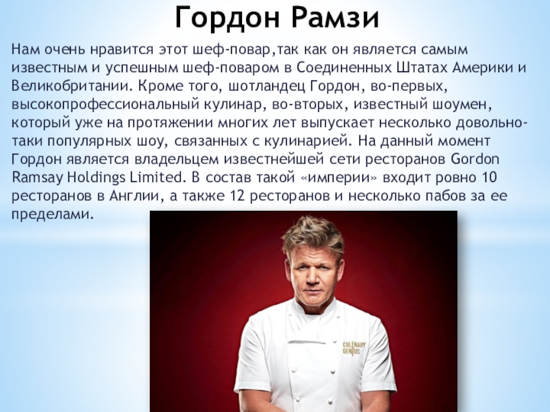 и успешным шеф-поваром в Соединенных Штатах Америки и Великобритании. Кроме того, шотландец Гордон, во-первых, высокопрофессиональный кулинар, во-вторых, известный шоумен, который уже на протяжении многих лет выпускает несколько довольно-таки популярных шоу, связанных с кулинарией. На данный момент Гордон является владельцем известнейшей сети ресторанов Gordon Ramsay Holdings Limited. В состав такой «империи» входит ровно 10 ресторанов в Англии, а также 12 ресторанов и несколько пабов за ее пределами.