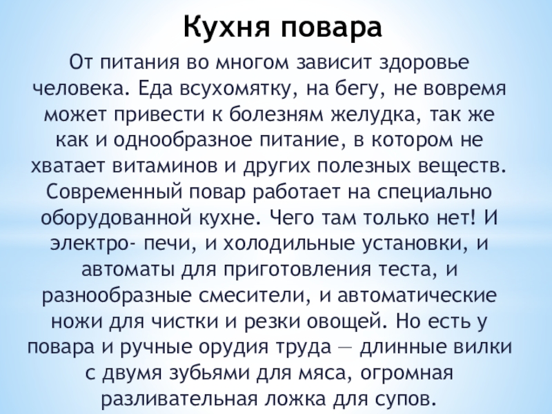 бегу, не вовремя может привести к болезням желудка, так же как и однообразное питание, в котором не хватает витаминов и других полезных веществ. Современный повар работает на специально оборудованной кухне. Чего там только нет! И электро- печи, и холодильные установки, и автоматы для приготовления теста, и разнообразные смесители, и автоматические ножи для чистки и резки овощей. Но есть у повара и ручные орудия труда — длинные вилки с двумя зубьями для мяса, огромная разливательная ложка для супов.