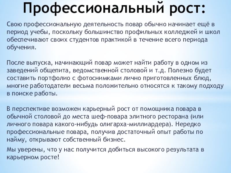 В перспективе возможен карьерный рост от помощника повара в обычной столовой до места шеф-повара элитного ресторана (или личного повара какого-нибудь олигарха-миллиардера). Нередко профессиональные повара, получив достаточный опыт работы по найму, открывают собственный бизнес.