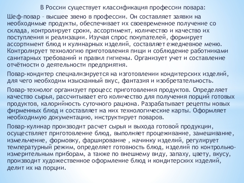 профессии. Он составляет заявки на необходимые продукты, обеспечивает их своевременное получение со склада, контролирует сроки, ассортимент, количество и качество их поступления и реализации. Изучая спрос покупателей, формирует ассортимент блюд и кулинарных изделий, составляет ежедневное меню. Контролирует технологию приготовления пищи и соблюдение работниками санитарных требований и правил гигиены. Организует учет и составление отчётности о деятельности предприятия.