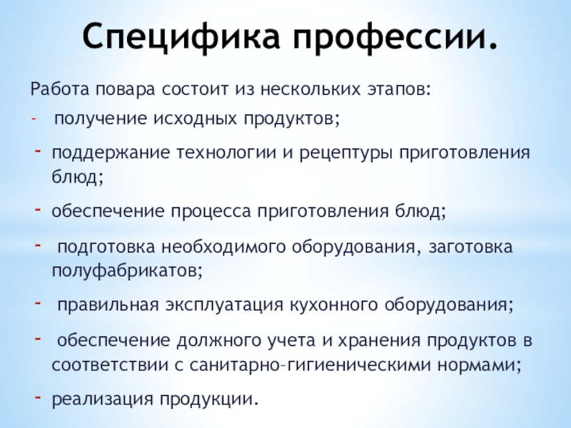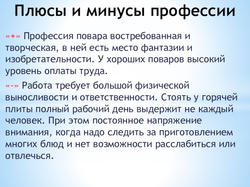 «-» Работа требует большой физической выносливости и ответственности. Стоять у горячей плиты полный рабочий день выдержит не каждый человек. При этом постоянное напряжение внимания, когда надо следить за приготовлением многих блюд и нет возможности расслабиться или отвлечься.