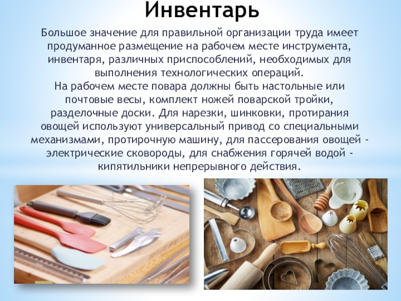 На рабочем месте повара должны быть настольные или почтовые весы, комплект ножей поварской тройки, разделочные доски. Для нарезки, шинковки, протирания овощей используют универсальный привод со специальными механизмами, протирочную машину, для пассерования овощей - электрические сковороды, для снабжения горячей водой - кипятильники непрерывного действия.