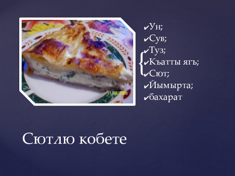 Ун;Сув;Туз;Къатты ягъ;Сют;Йымырта;бахаратСютлю кобете