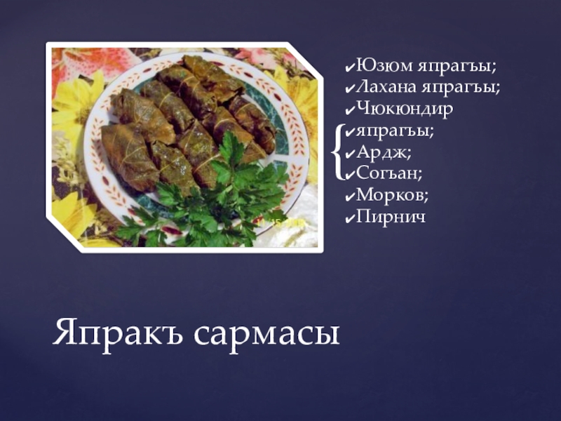 Юзюм япрагъы; Лахана япрагъы;Чюкюндиряпрагъы;Ардж;Согъан;Морков;ПирничЯпракъ сармасы