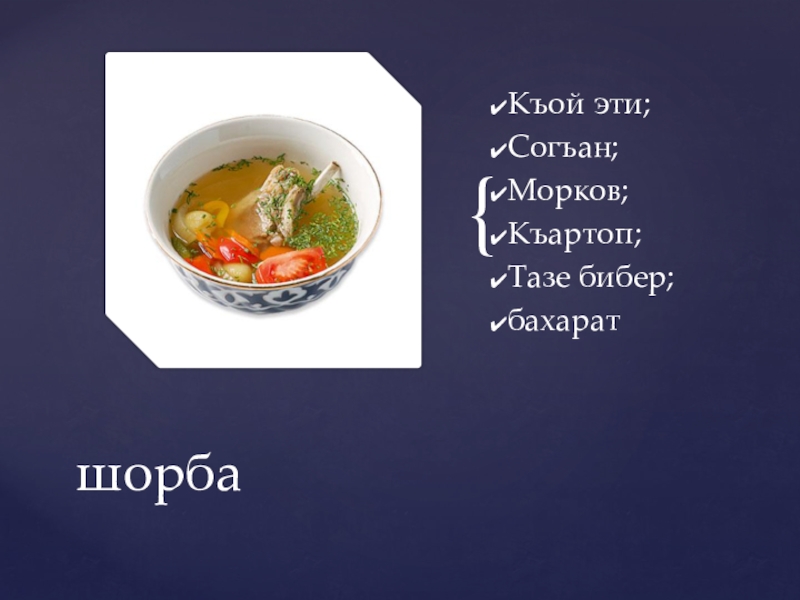 Къой эти;Согъан;Морков;Къартоп;Тазе бибер;бахаратшорба