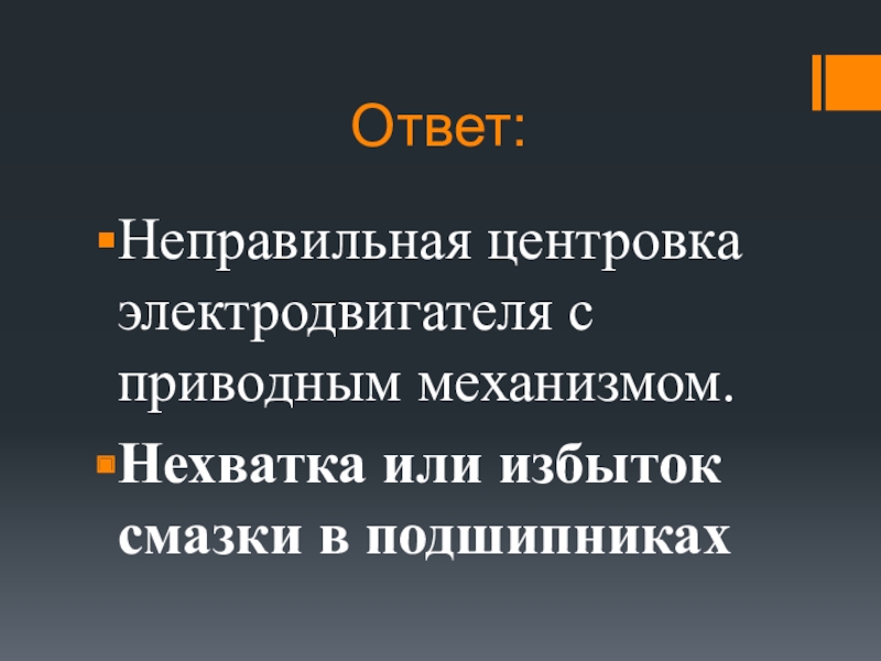 Ответ:Неправильная центровка электродвигателя с приводным механизмом.Нехватка или избыток смазки в подшипниках