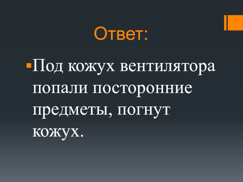 Ответ:Под кожух вентилятора попали посторонние предметы, погнут кожух.