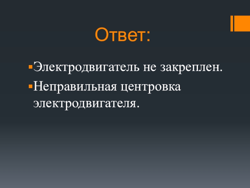 Ответ:Электродвигатель не закреплен.Неправильная центровка электродвигателя.