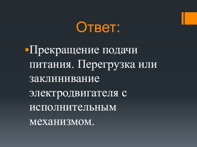 Ответ:Прекращение подачи питания. Перегрузка или заклинивание электродвигателя с исполнительным механизмом.