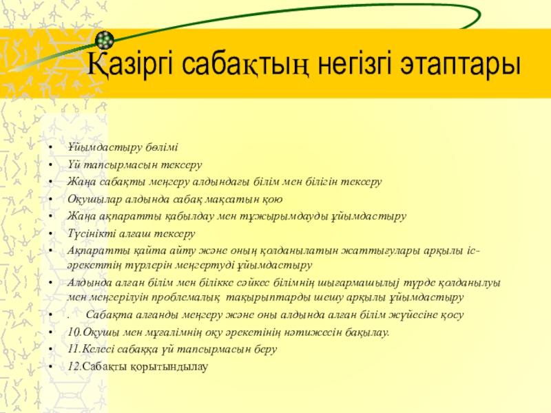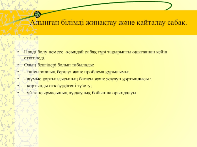 Слайд 13Алынған білімді жинақтау және қайталау сабақ.