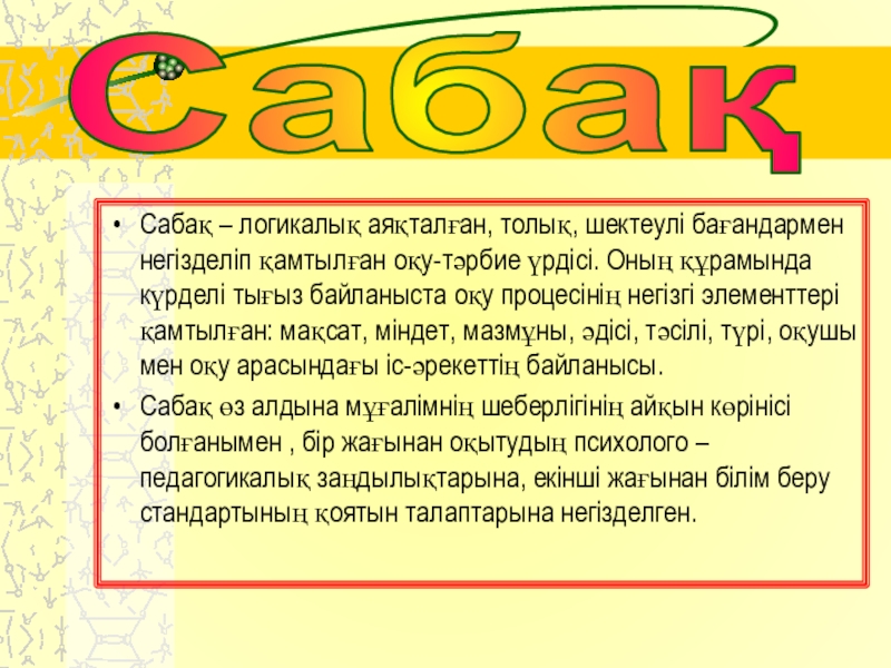 Слайд 4Сабақ – логикалық аяқталған, толық, шектеулі бағандармен негізделіп қамтылған оқу-тәрбие үрдісі.