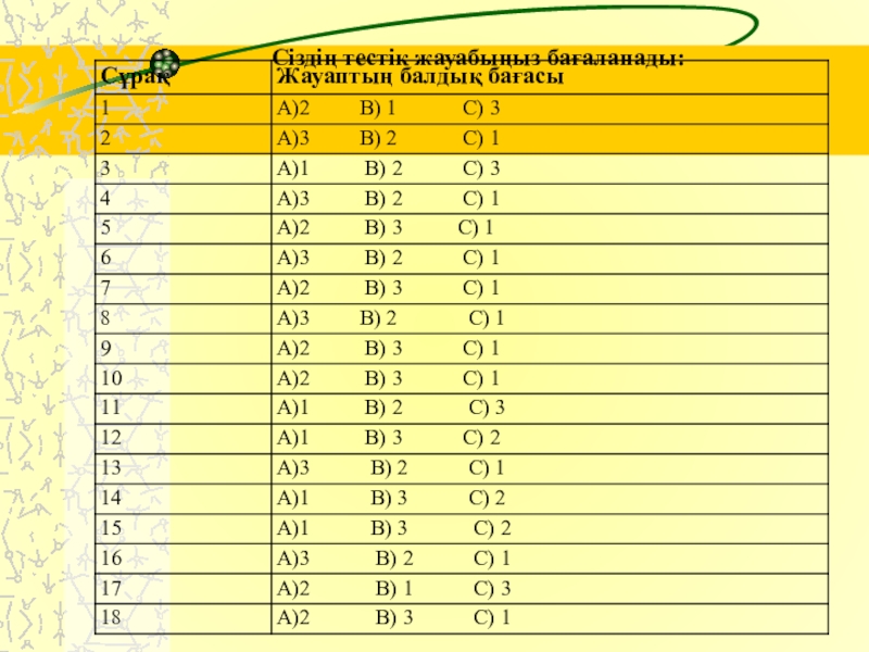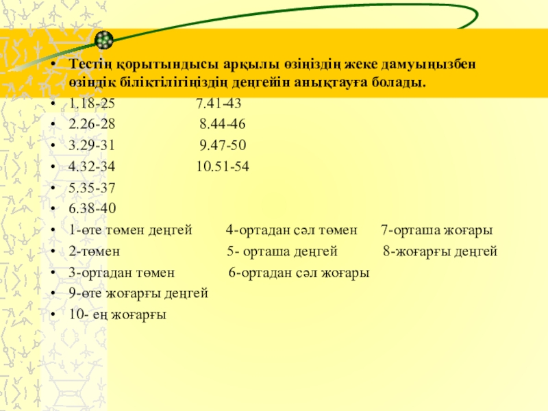 Слайд 27Тестің қорытындысы арқылы өзіңіздің жеке дамуыңызбен өзіндік біліктілігіңіздің деңгейін анықтауға болады.