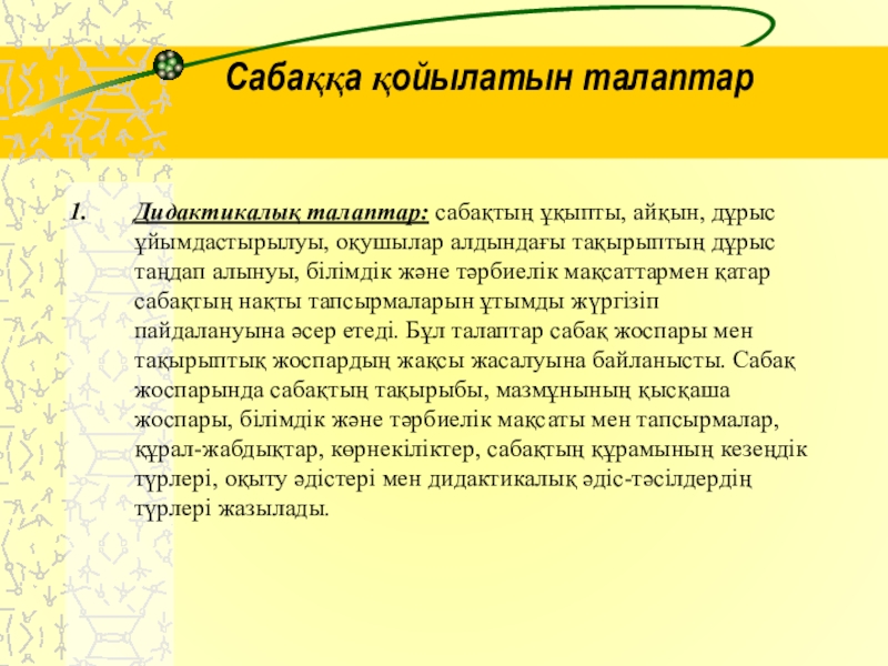 Дидактикалық талаптар: сабақтың ұқыпты, айқын, дұрыс ұйымдастырылуы, оқушылар алдындағы