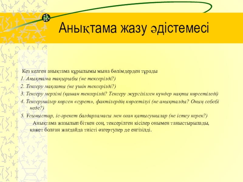 4. Тексерушілер көрген «сурет», фактілердің көрсетілуі (не анықталды? Оның себебі неде?)