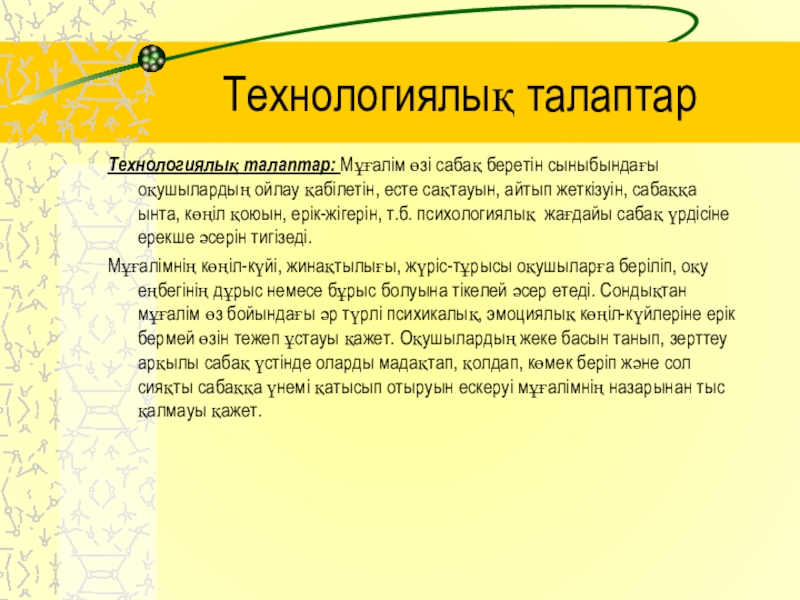 Технологиялық талаптар: Мұғалім өзі сабақ беретін сыныбындағы оқушылардың ойлау қабілетін,