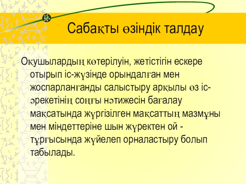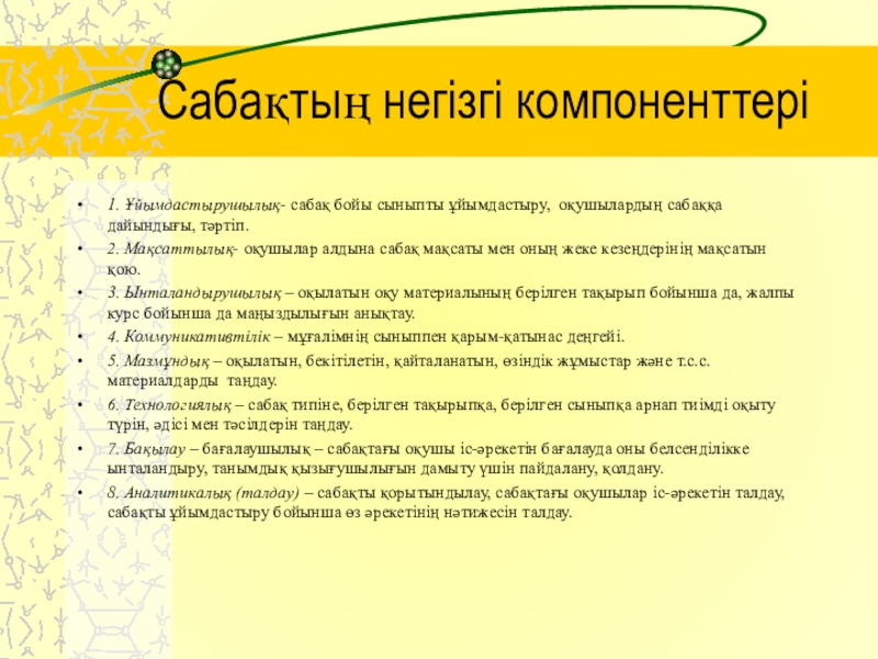 8. Аналитикалық (талдау) – сабақты қорытындылау, сабақтағы оқушылар іс-әрекетін талдау, сабақты ұйымдастыру бойынша өз әрекетінің нәтижесін талдау.