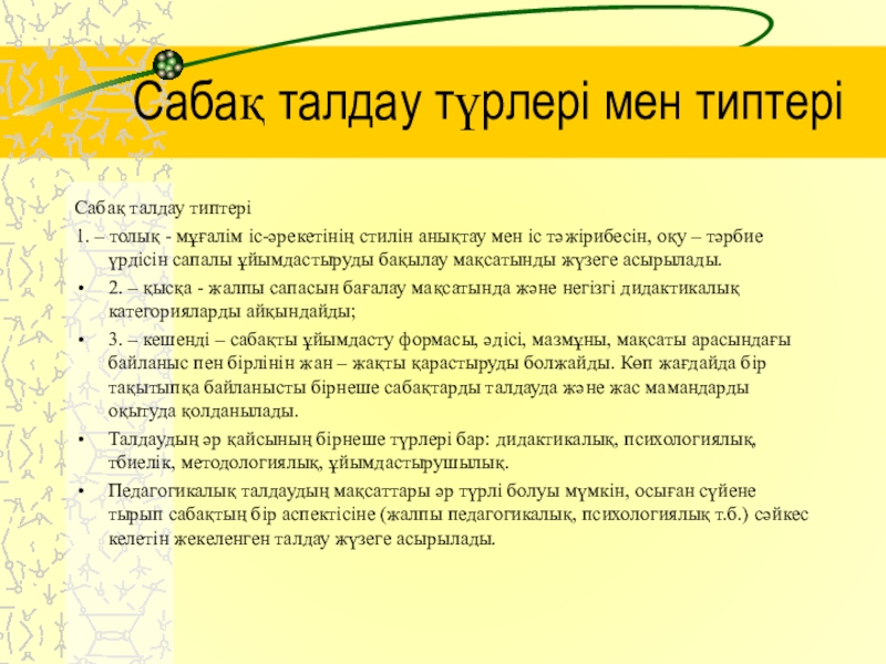 3. – кешенді – сабақты ұйымдасту формасы, әдісі, мазмұны, мақсаты арасындағы байланыс пен бірлінін жан – жақты қарастыруды болжайды. Көп жағдайда бір тақытыпқа байланысты бірнеше сабақтарды талдауда және жас мамандарды оқытуда қолданылады.