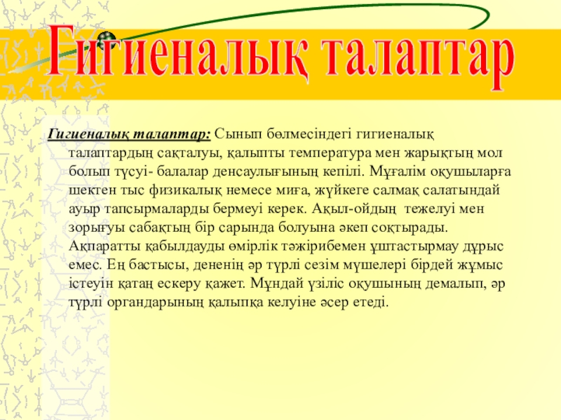 Гигиеналық талаптар: Сынып бөлмесіндегі гигиеналық талаптардың сақталуы, қалыпты температура мен