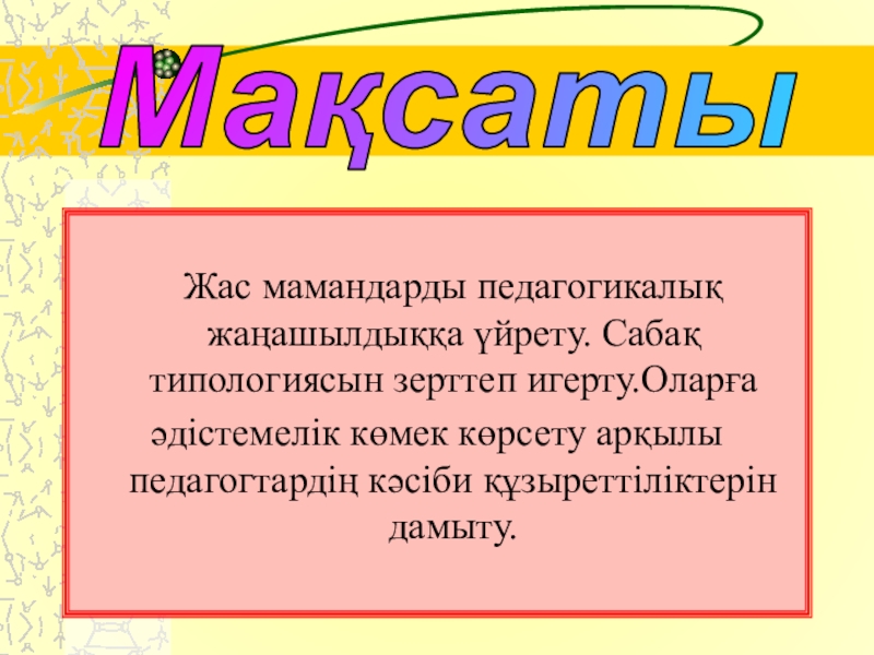 Жас мамандарды педагогикалық жаңашылдыққа үйрету. Сабақ типологиясын зерттеп игерту.Оларға