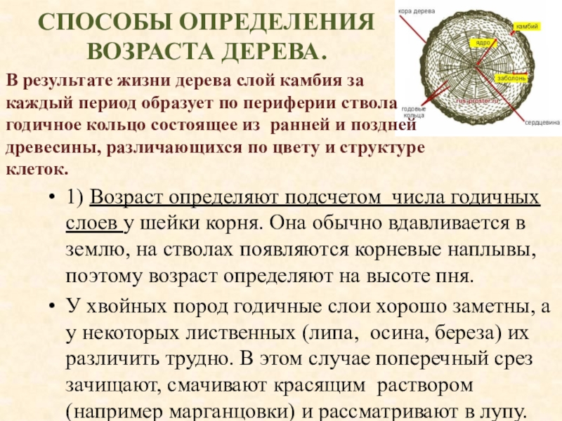 В результате жизни дерева слой камбия за каждый период образует по периферии ствола годичное кольцо состоящее из ранней и поздней древесины, различающихся по цвету и структуре клеток.