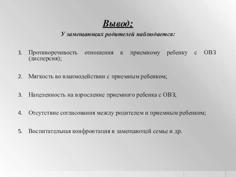 вида или поведения. Замещающие родители, воспитывающие приемных детей с ОВЗ, придают большее значение нарушениям поведения ребенка, чем кровные.