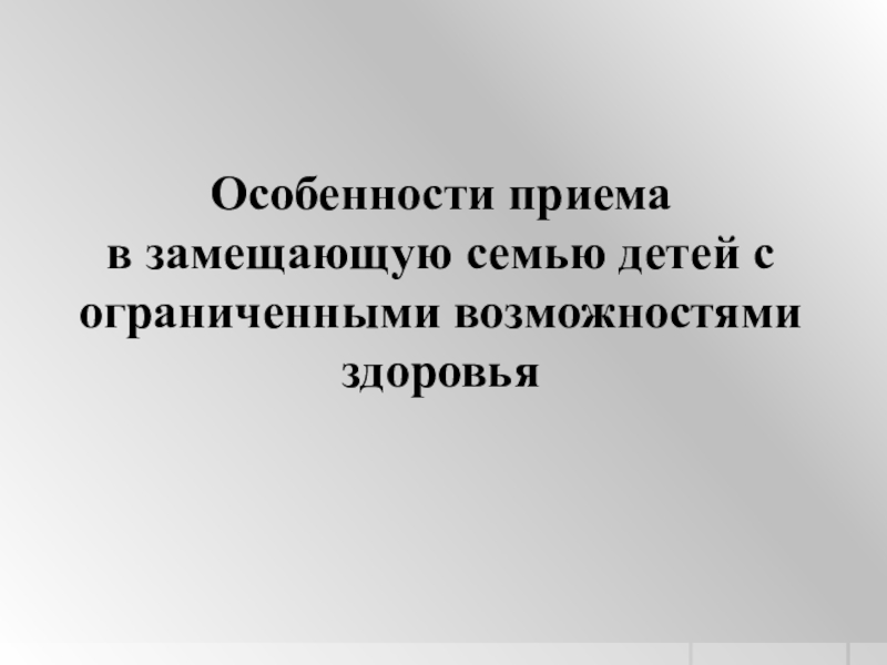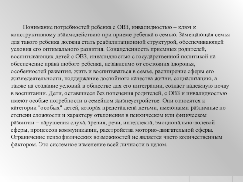 при приеме ребенка в семью. Замещающая семья для такого ребенка должна стать реабилитационной структурой, обеспечивающей условия его оптимального развития. Сонацеленность приемных родителей, воспитывающих детей с ОВЗ, инвалидностью с государственной политикой на обеспечение права любого ребенка, независимо от состояния здоровья, особенностей развития, жить и воспитываться в семье, расширение сферы его жизнедеятельности, поддержание достойного качества жизни, социализацию, а также на создание условий в обществе для его интеграции, создаст надежную почву в воспитании. Дети, оставшиеся без попечения родителей, с ОВЗ и инвалидностью имеют особые потребности в семейном жизнеустройстве. Они относятся к категории "особых" детей, которая представлена детьми, имеющими различные по степени сложности и характеру отклонения в психическом или физическом развитии – нарушения слуха, зрения, речи, интеллекта, эмоционально-волевой сферы, процессов коммуникации, расстройства моторно-двигательной сферы. Ограничение психофизических возможностей не является чисто количественным фактором. Это системное изменение всей личности в целом.