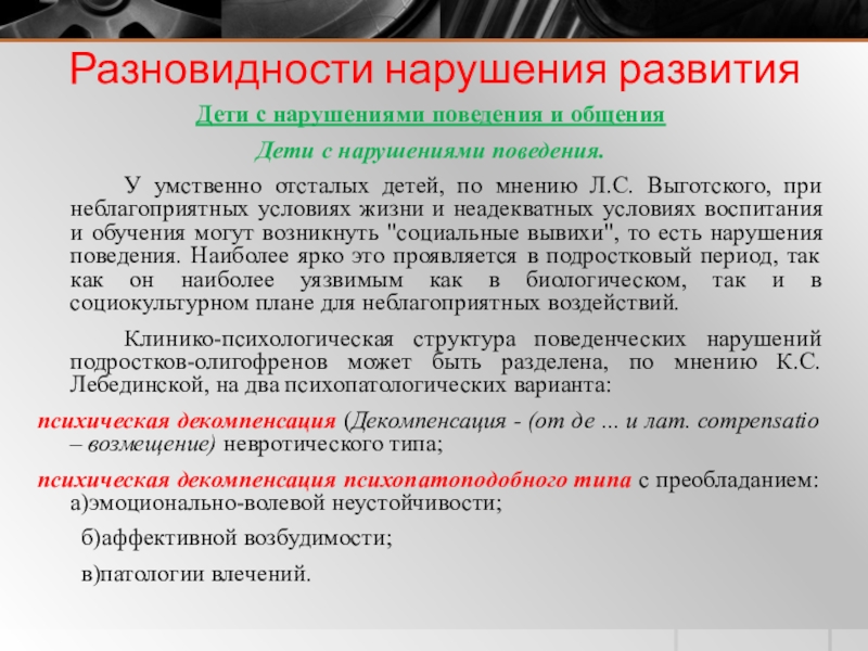 У умственно отсталых детей, по мнению Л.С. Выготского, при неблагоприятных условиях жизни и неадекватных условиях воспитания и обучения могут возникнуть "социальные вывихи", то есть нарушения поведения. Наиболее ярко это проявляется в подростковый период, так как он наиболее уязвимым как в биологическом, так и в социокультурном плане для неблагоприятных воздействий.