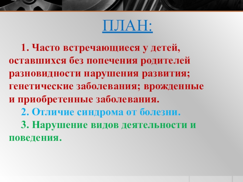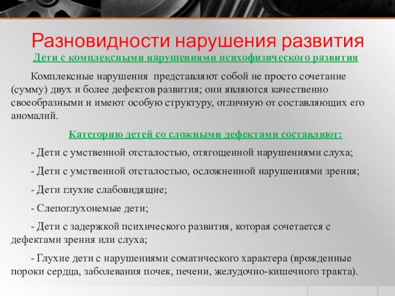 разновидности нарушения развития; генетические заболевания; врожденные