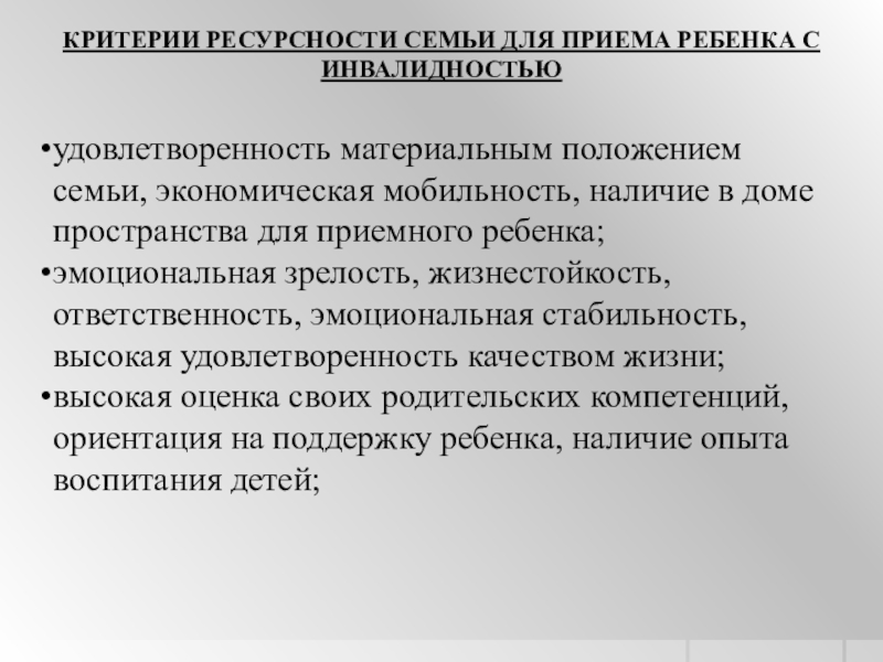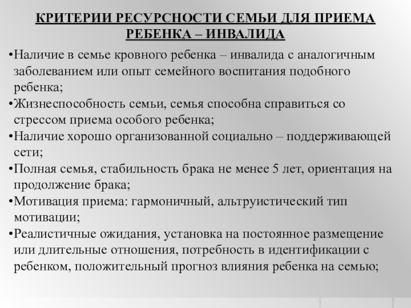 Слайд 47КРИТЕРИИ РЕСУРСНОСТИ СЕМЬИ ДЛЯ ПРИЕМА РЕБЕНКА – ИНВАЛИДА