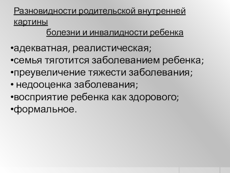 • недооценивание родителями серьезности состояния здоровья ребенка с ОВЗ, инвалидностью, недостаточное понимание необходимости оказания специализированной помощи, неадекватное восприятие внутренней картины болезни и инвалидности ребенка;