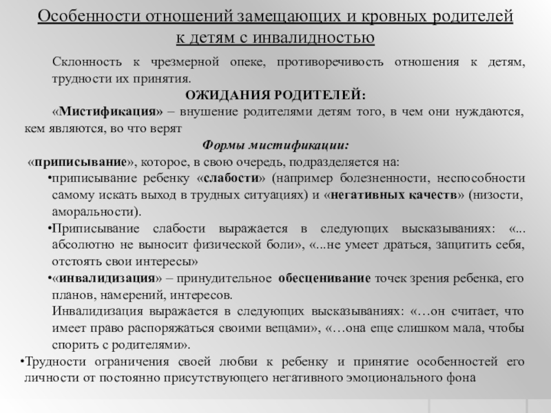 чрезмерной опеке, противоречивость отношения к детям, трудности их принятия.