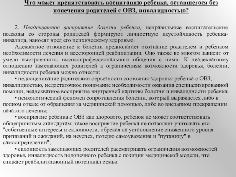 Адекватное отношение к болезни предполагает осознание родителем и ребенком необходимости лечения и всесторонней реабилитации. Оно также во многом зависит от умело выстроенного, высокопрофессионального общения с ними. К неадекватному отношению замещающих родителей к ограничениям возможности здоровья, болезни, инвалидности ребенка можно отнести: