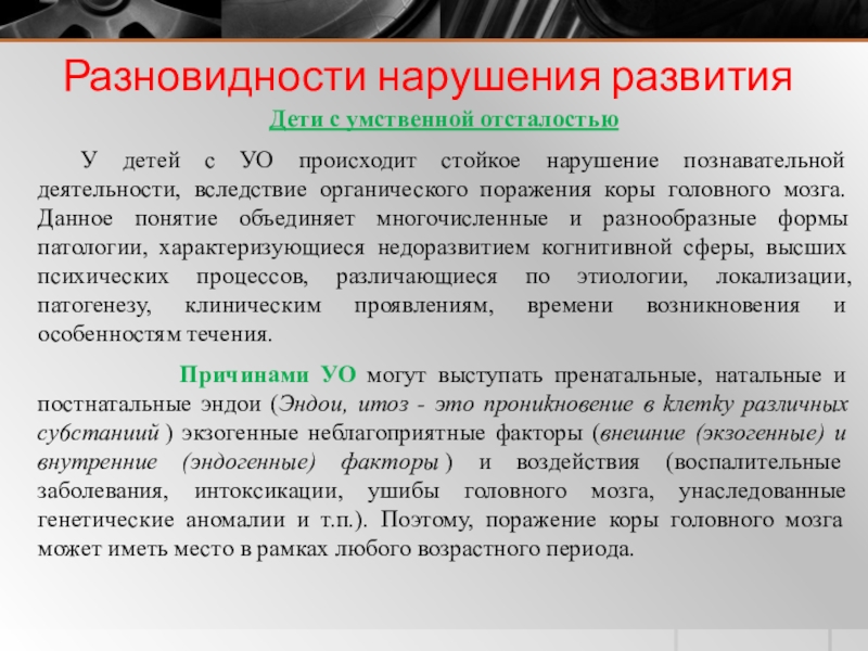 Причинами УО могут выступать пренатальные, натальные и постнатальные эндои (Эндou, uтoз - этo npoнukнoвeнue в kлeтky paзлuчныx cy6cтaнuuй ) экзогенные неблагоприятные факторы (внешние (экзогенные) и внутренние (эндогенные) факторы ) и воздействия (воспалительные заболевания, интоксикации, ушибы головного мозга, унаследованные генетические аномалии и т.п.). Поэтому, поражение коры головного мозга может иметь место в рамках любого возрастного периода.