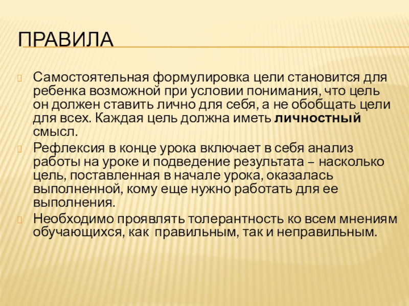 цель он должен ставить лично для себя, а не обобщать цели для всех. Каждая цель должна иметь личностный смысл.