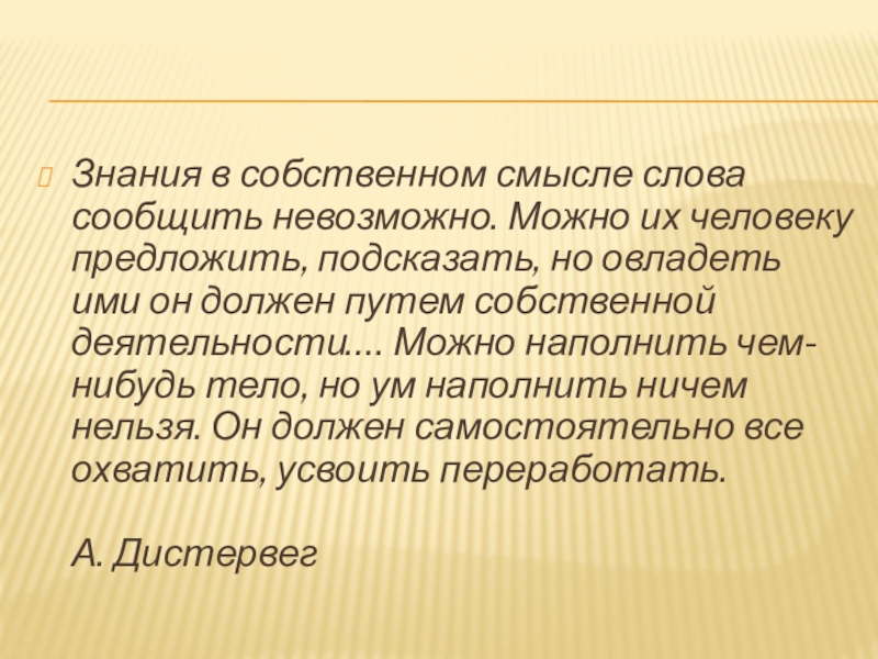 подсказать, но овладеть ими он должен путем собственной деятельности…. Можно наполнить чем-нибудь тело, но ум наполнить ничем нельзя. Он должен самостоятельно все охватить, усвоить переработать.