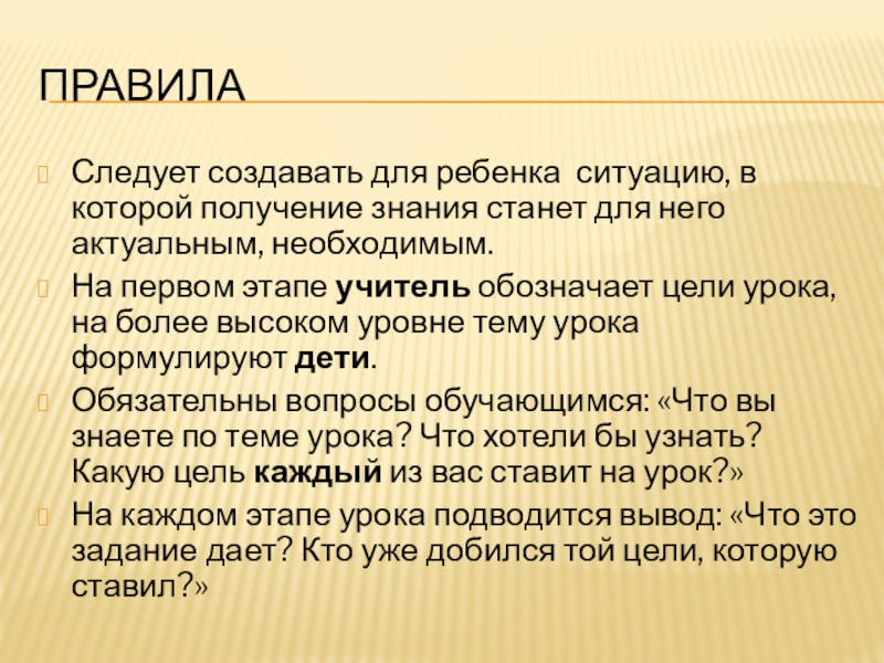 Следует создавать для ребенка ситуацию, в которой получение знания станет для