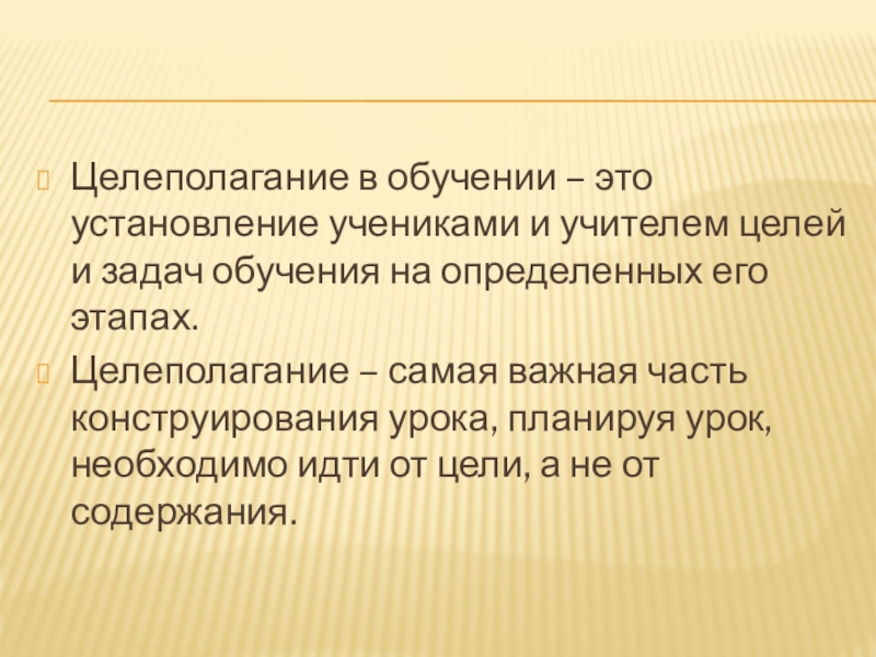 Целеполагание – самая важная часть конструирования урока, планируя урок, необходимо идти от цели, а не от содержания.