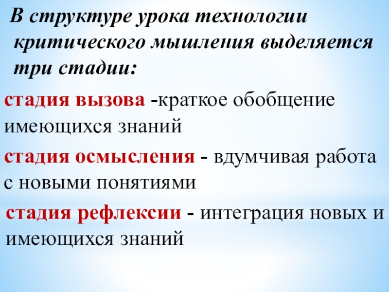 Слайд 3 В структуре урока технологии критического мышления выделяется три стадии: