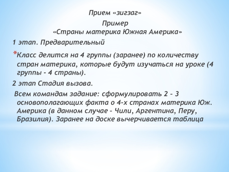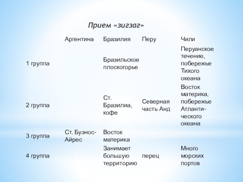 Всем командам задание: сформулировать 2 – 3 основополагающих факта о 4-х странах материка Юж. Америка (в данном случае – Чили, Аргентина, Перу, Бразилия). Заранее на доске вычерчивается таблица