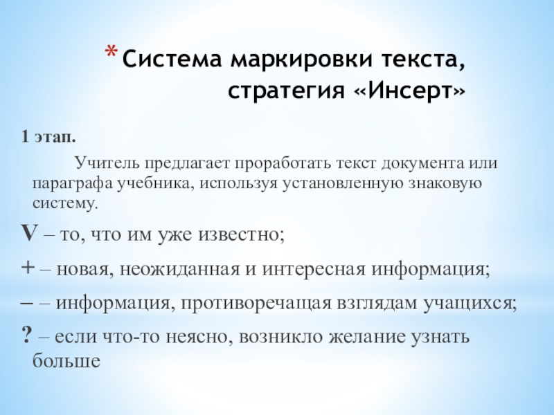 Слайд 6Система маркировки текста, стратегия «Инсерт»