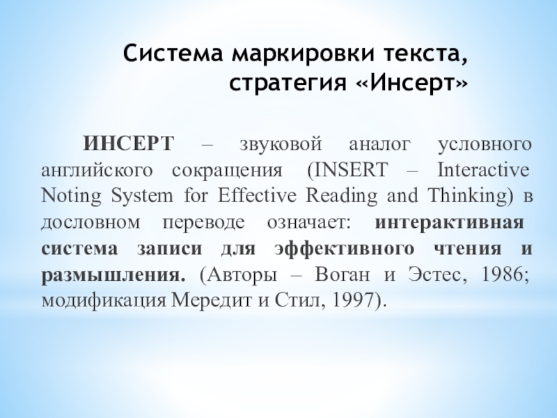 английского сокращения (INSERT – Interactive Noting System for Effective Reading and Thinking) в дословном переводе означает: интерактивная система записи для эффективного чтения и размышления. (Авторы – Воган и Эстес, 1986; модификация Мередит и Стил, 1997).
